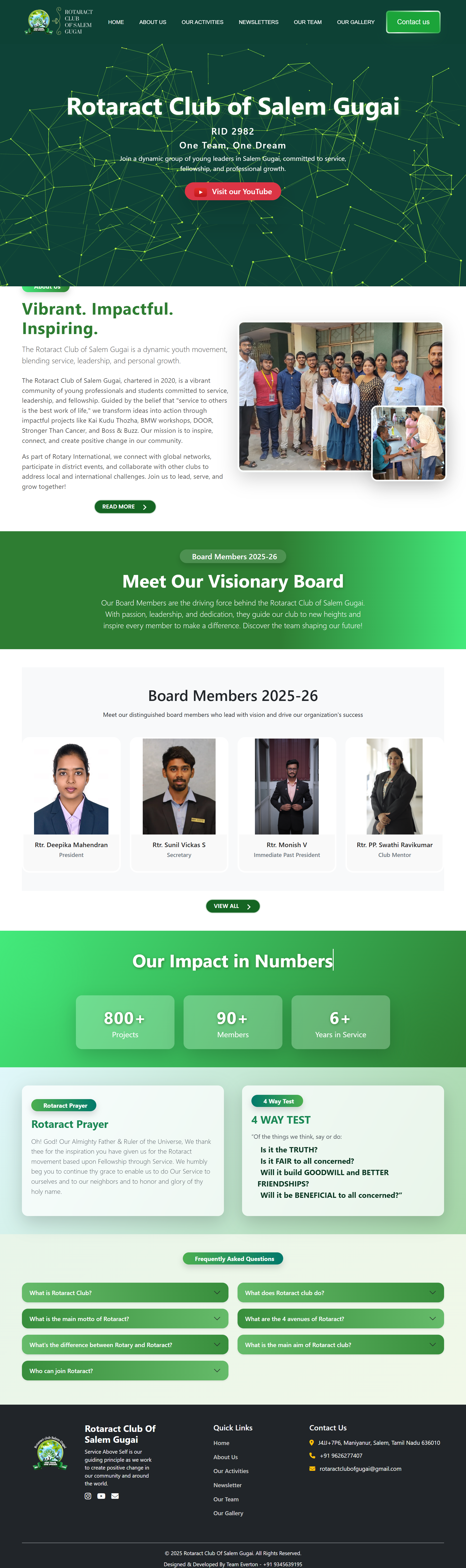 The Rotaract Club of Salem Gugai, founded in 2020, is a youth-driven community committed to service, leadership, and fellowship. Led by President Rtr. Deepika and Secretary Rtr. Sunil Vickas, we empower change through impactful initiatives like Kai Kudu Thozha, DOOR, Stronger Than Cancer, Business Mindset Workshops, and Boss & Buzz. With compassion and action, we serve society while fostering personal growth, proving that small efforts create big impact. Join us to lead, connect, and serve.