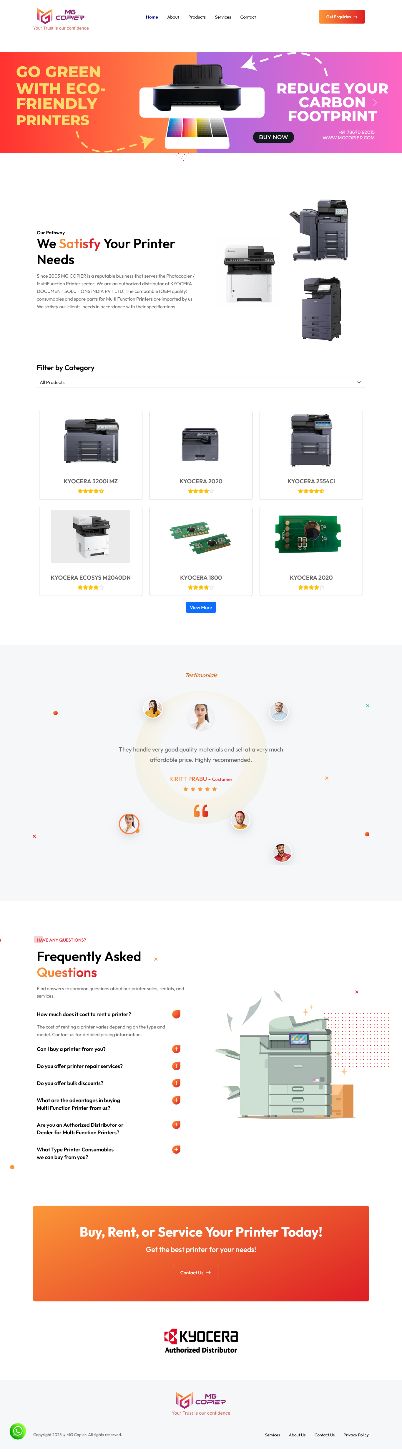 MG COPIER is a reputable business that serves the Photocopier / MultiFunction Printer sector. We are an authorized distributor of KYOCERA DOCUMENT SOLUTIONS INDIA PVT LTD. The compatible (OEM quality) consumables and spare parts for Multi Function Printers are imported by us. We satisfy our clients' needs in accordance with their specifications.